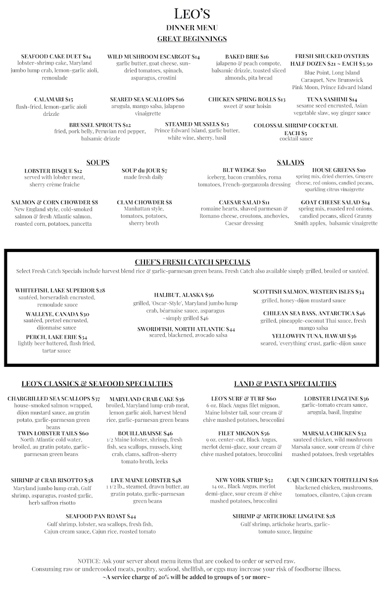 The culinary offerings are where Leo's truly shines. The dinner menu features a variety of delectable options, including fresh salads like the BLT Salad with crispy bacon and creamy bleu cheese dressing, and the vibrant Burrata Salad, showcasing grilled nectarines with balsamic vinaigrette. For the main course, you can’t go wrong with their seafood selections. The Shrimp & Lobster Linguine and Charred Scallops have garnered rave reviews for their freshness and exquisite flavor profiles. Meat lovers will find joy in the perfectly cooked Filet Mignon and New York Strip, each paired beautifully with rich sides like sour cream and chive mashed potatoes, ensuring a hearty meal that satisfies.